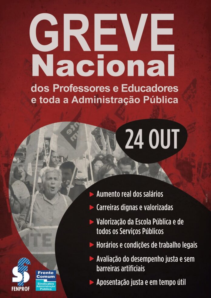 Dia 24 de Outubro, vamos mostrar ao governo a força que temos e defender as propostas que apresentamos, aderindo em massa à GREVE NACIONAL DE PROFESSORES, EDUCADORES E INVESTIGADORES!